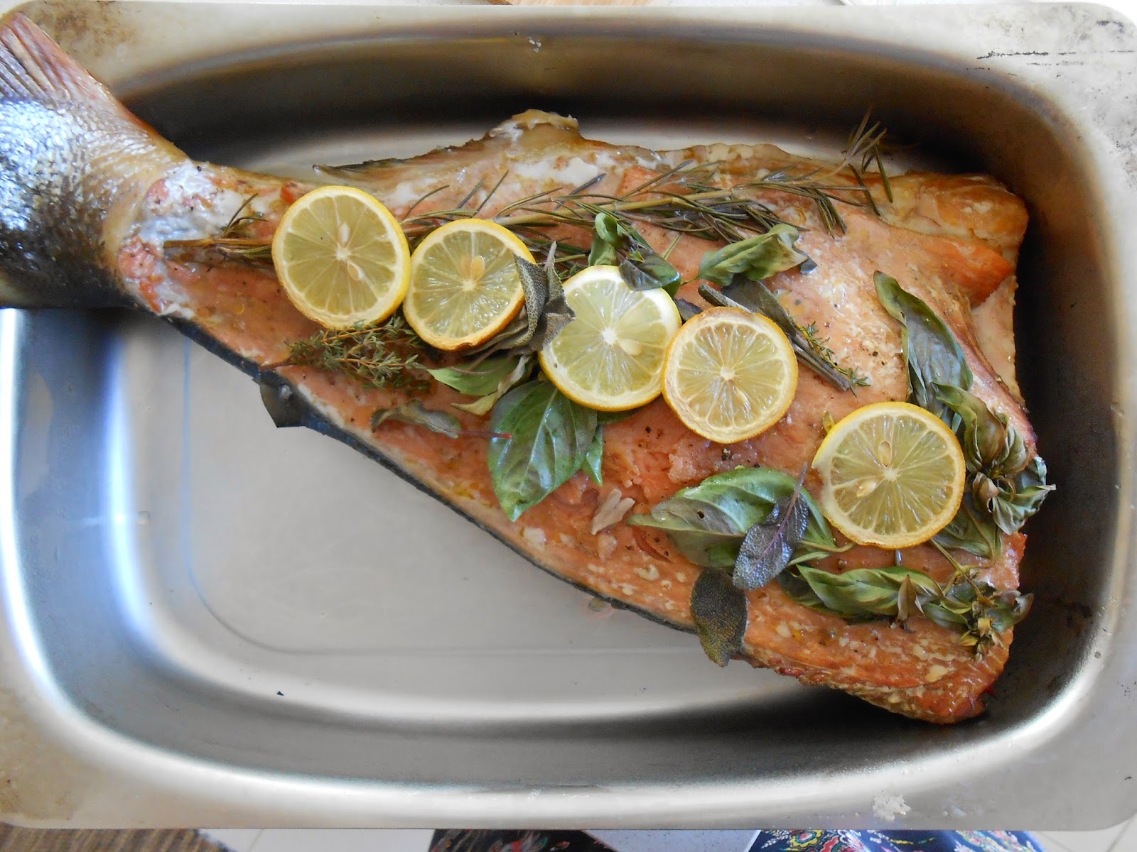 Num grelhador com tampa, acender as brasas apenas num lado do grelhador. Quando estiverem bem acesas, pincela-se o peixe com azeite, tempera-se generosamente de sal e pimeta, e coloca-se as ervas e o limão às fatias sobre o peixe. Coloca-se na grelha do lado que não tem brasas, tapa-se, e deixa-se fumar durante 20 a 30 minutos, dependendo muito do tamanho do salmão.
